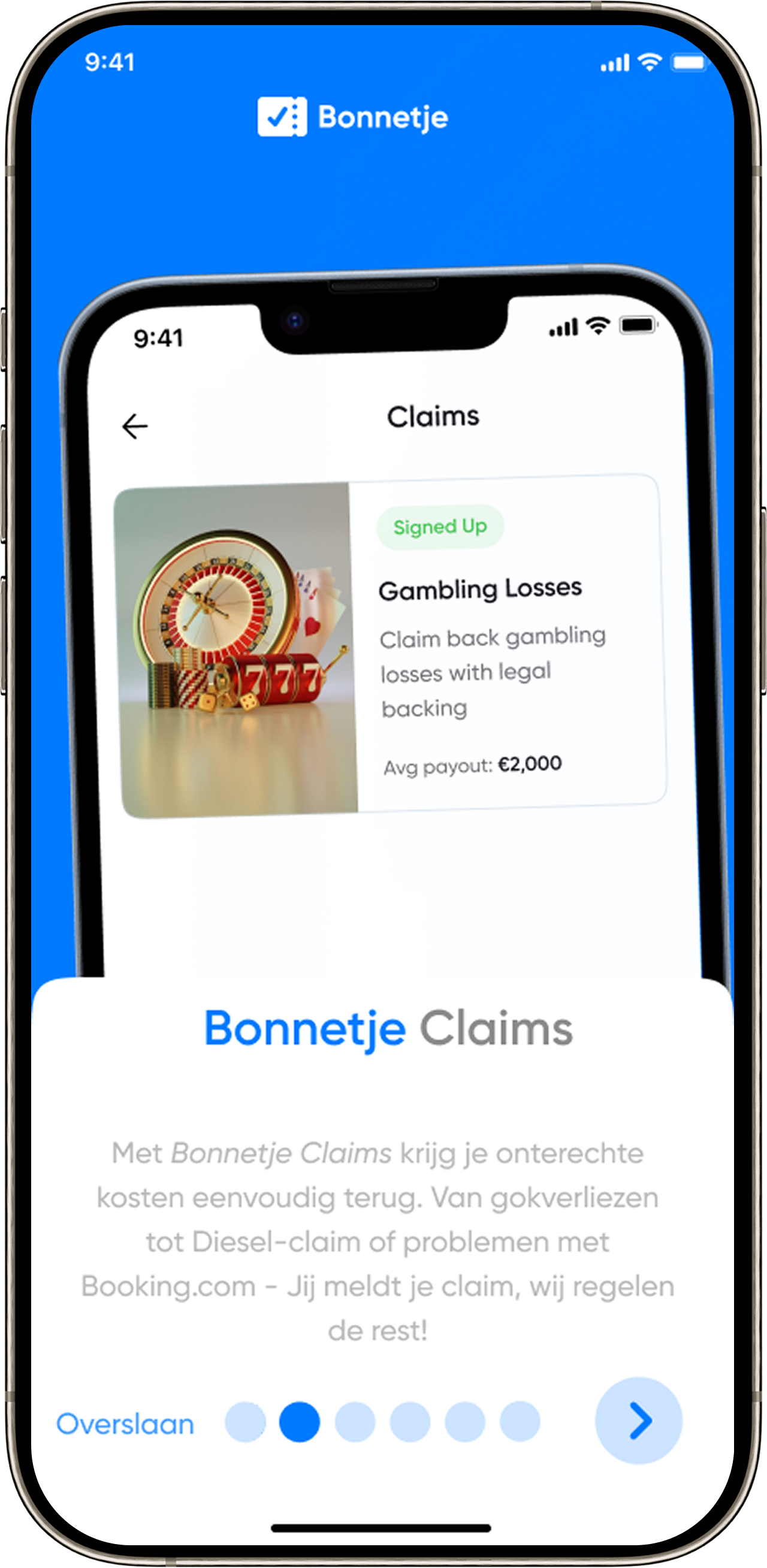 Bonnetje is een consumentenplatform dat juridische dienstverlening toegankelijk maakt. Via de Bonnetje-app meld je je eenvoudig aan voor één of meerdere claims — allemaal op één plek.